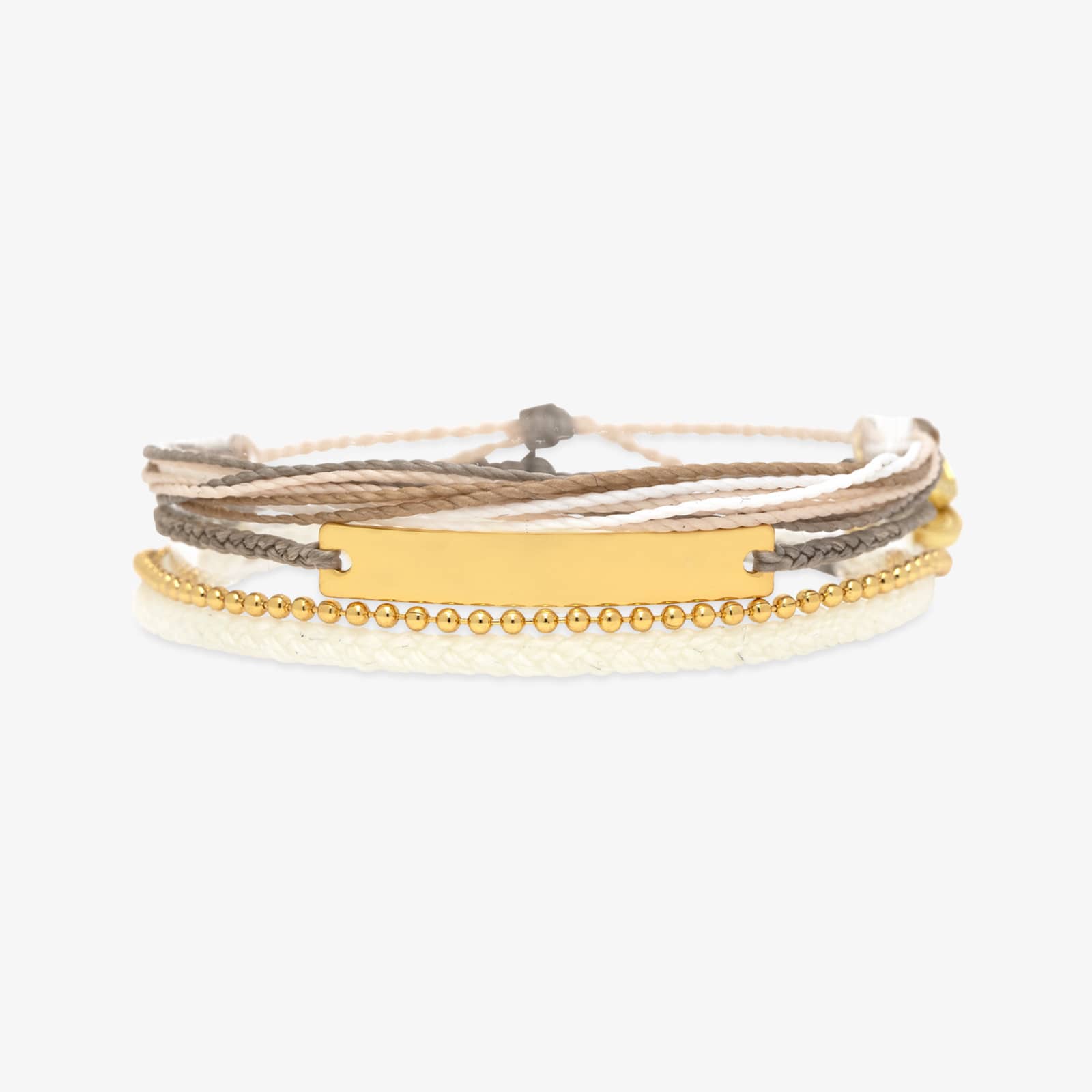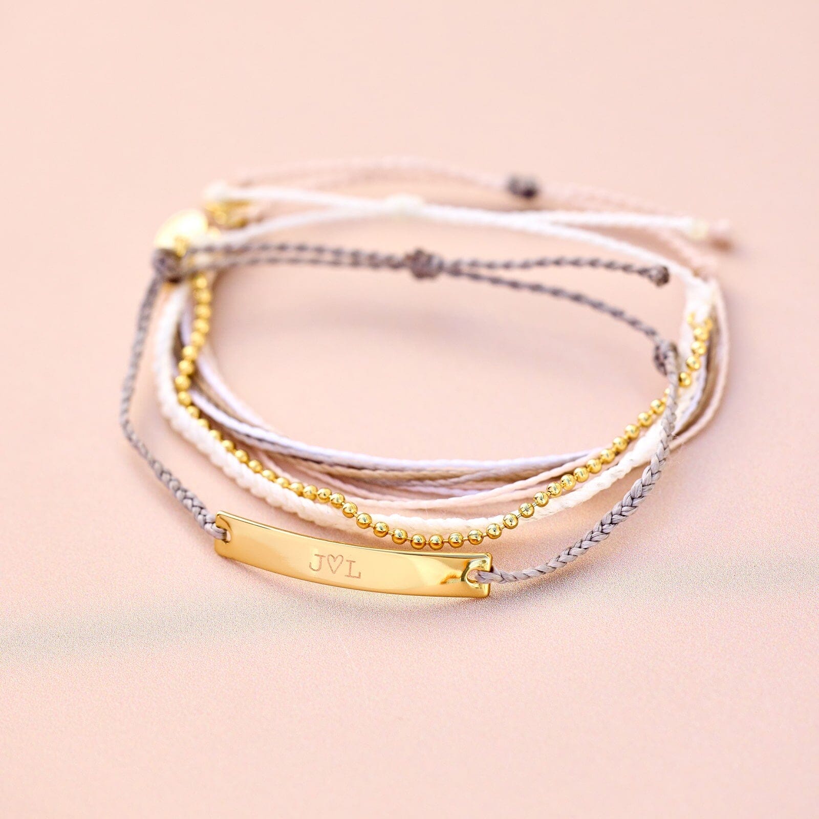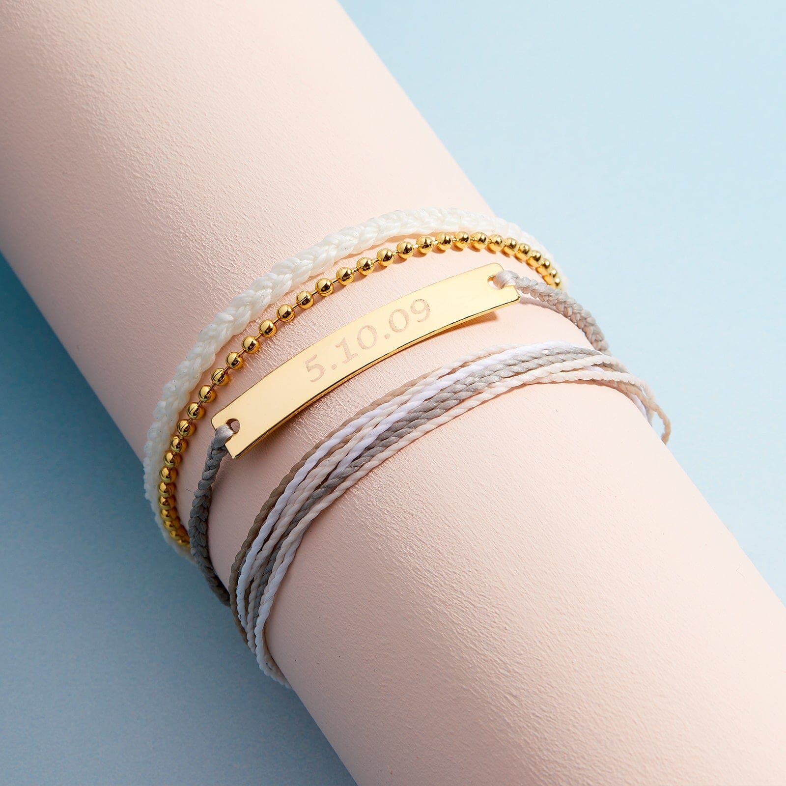 features a gold-plated ball chain, a simple and signature string style, and an engravable bar bracelet set on a bitty braid. Plus, you can personalize it with the name of someone special, an important date, a meaningful message or cute symbols!