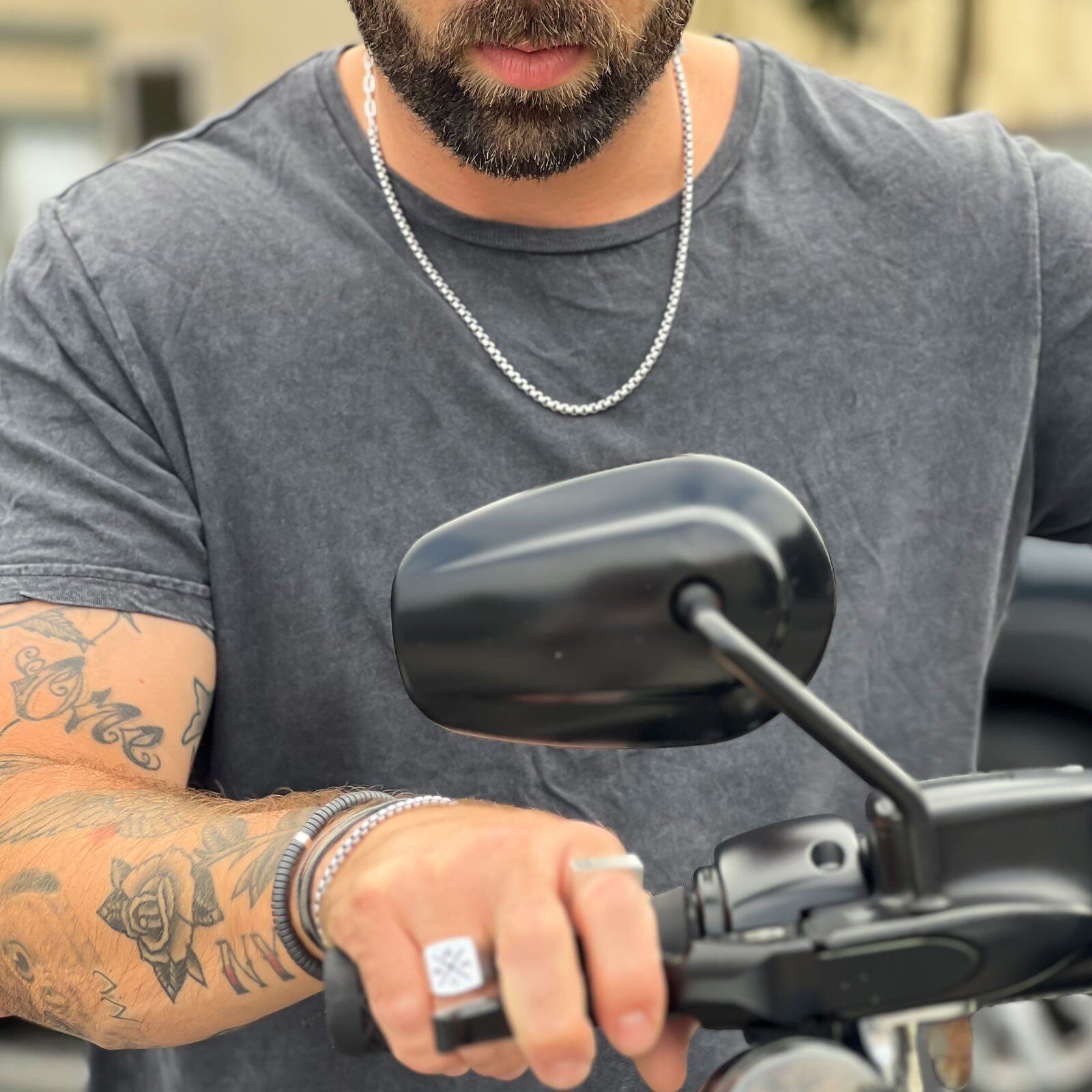 Dress to impress with our Men's Rolo Chain Necklace! Crafted with a sleek and modern look, it's made of sturdy stainless steel and comes in a cool black and silver combination. It's the perfect accessory to add some style to any outfit.