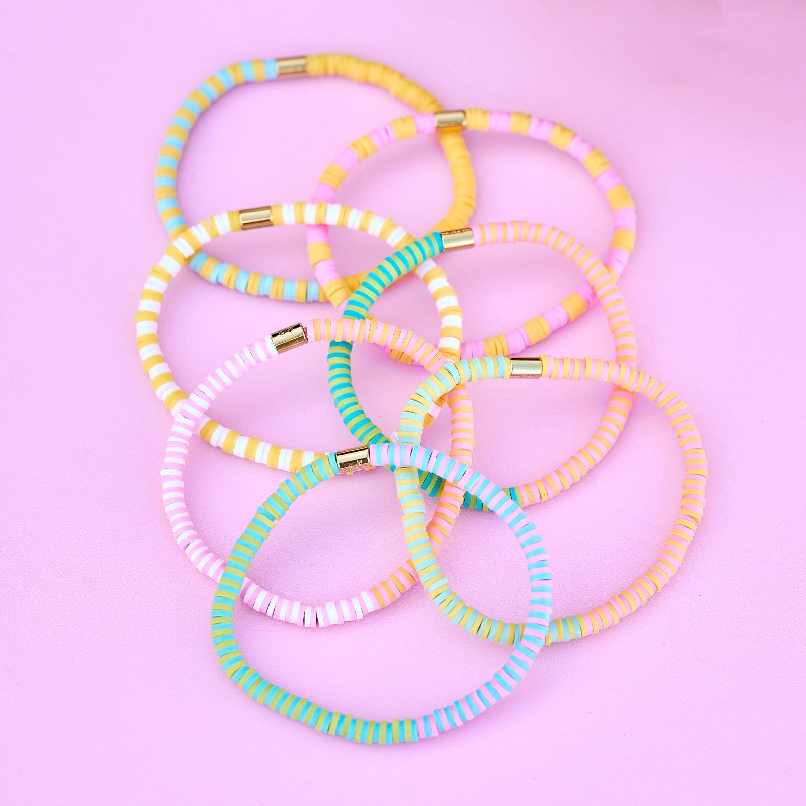 The best-selling Vacation Vibe Stretch Bracelet pack has been re-imagined in stunning summer shades! Featuring 8 individual, slip-on stretch styles in vibrant pastels, this set can be worn all together, mixed and matched with favorite combinations, or shared with your friends. Each bracelet is handmade, waterproof and totally unique!Waterproof
